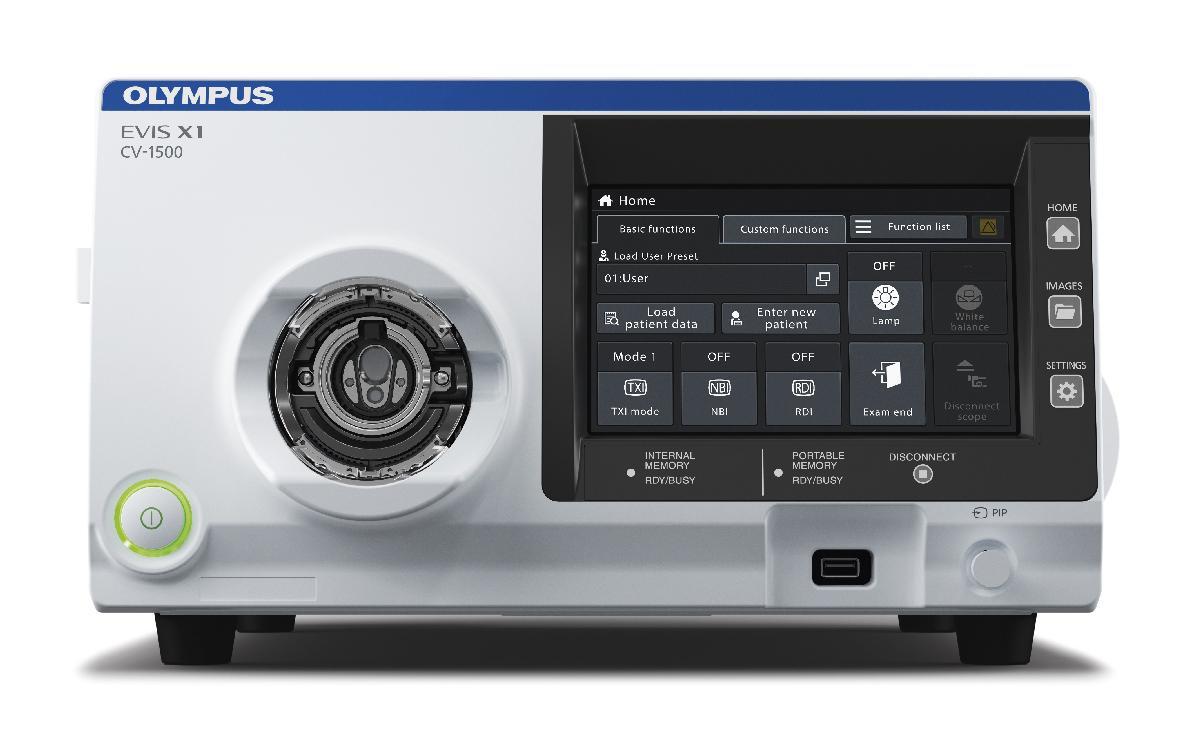 Olympus CV-1500 — центральный блок эндоскопической системы EVIS X1, который сочетает в одном корпусе видеопроцессор и высокоресурсный LED-источник света. Такое решение снижает занимаемое место в стойке, упрощает компоновку и уменьшает количество подключений. Система поддерживает работу в стандартном белом свете и расширенный набор режимов улучшенного наблюдения: NBI для усиления сосудистого рисунка, TXI для повышения контрастности и выраженности текстуры слизистой, RDI для визуализации источников кровотечения, AFI для оценки участков с изменённым метаболизмом и BAI-MAC для выравнивания яркости без потери контраста. Обработка изображения реализуется в реальном времени, без заметной задержки видеосигнала, что позволяет сохранять привычный темп исследования.