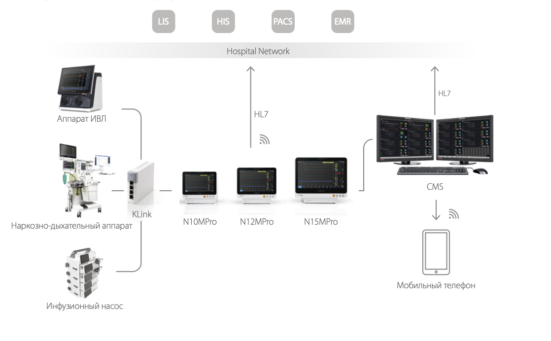 | Интеграция | Передача данных/кривых/тревог на ЦСМ; подключение к EMR/HIS/PACS по HL7 |